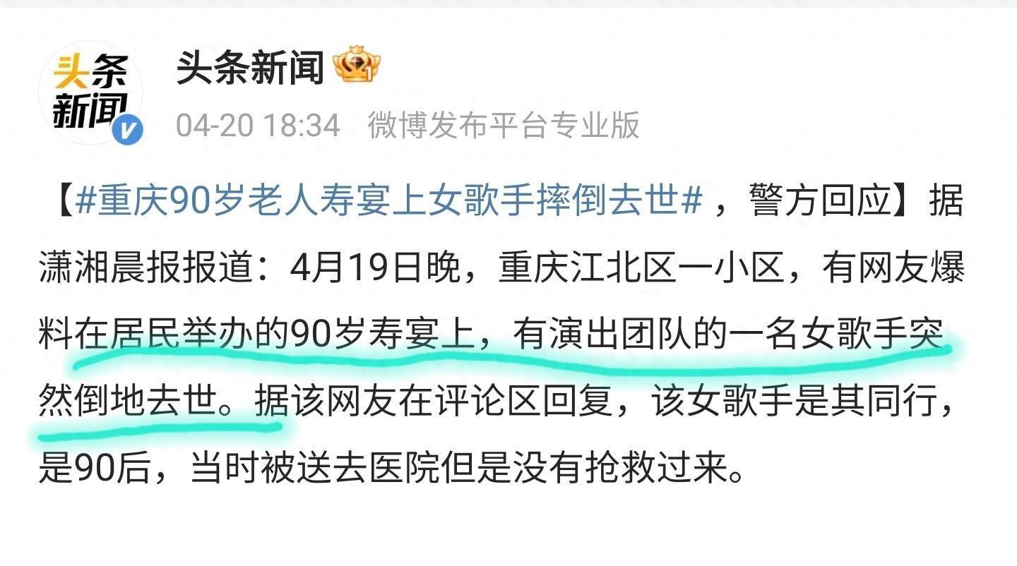 4月19日,重庆一位90岁乐龄的老东谈主举办寿宴,却不想有女歌手在舞台跌倒后死字,网友:老迈的还在,年青的先没了,真不知谈来日和不测哪个先来!